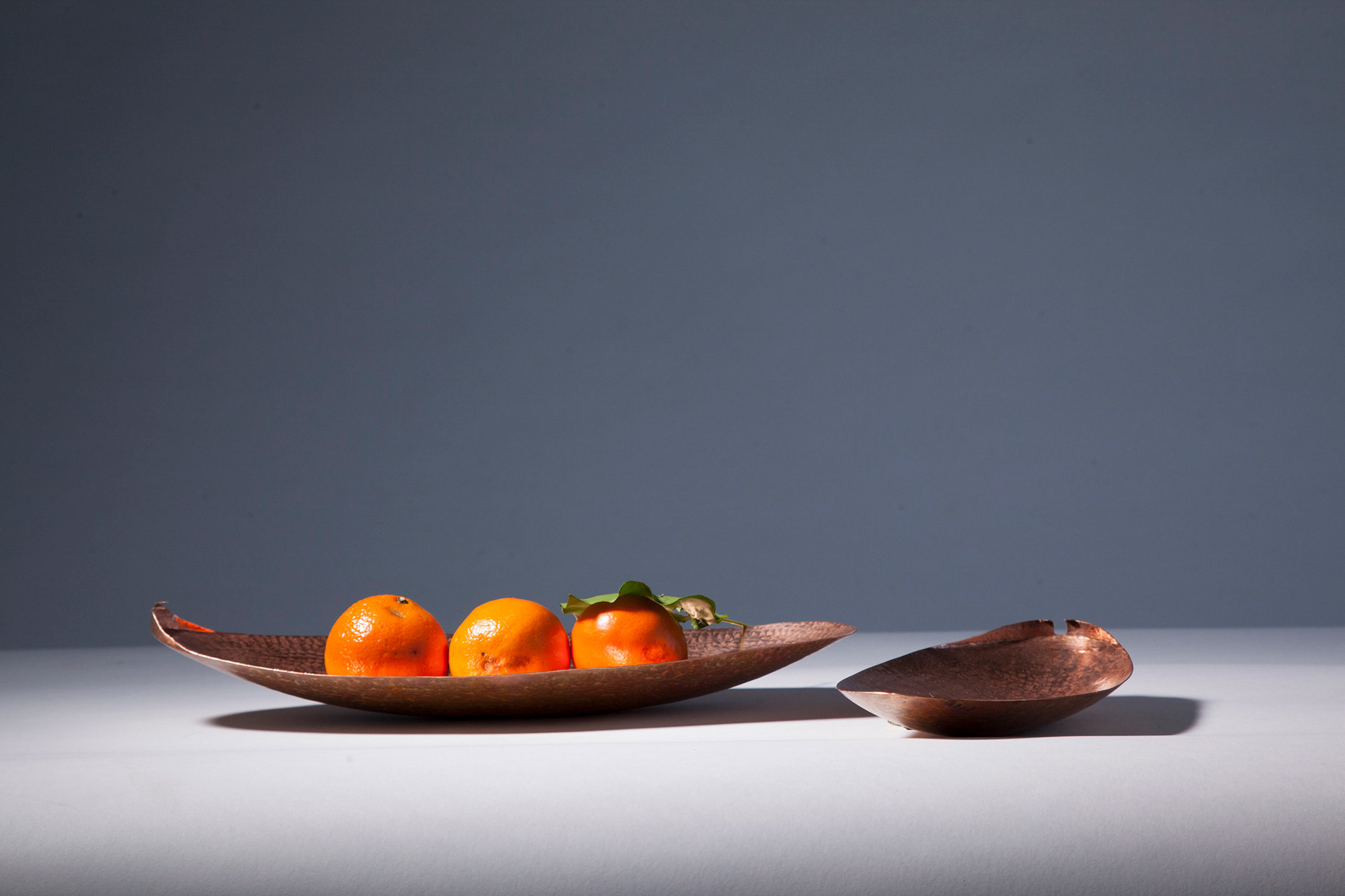 The lamp is composed of two pairs of copper “leaves.” In each pair, one leaf is fixed and treated to resist oxidation, while the other is detachable and left raw — allowed to age, darken, and slowly detach.. Like an autumn leaf, it eventually falls, transforming into a small copper bowl.