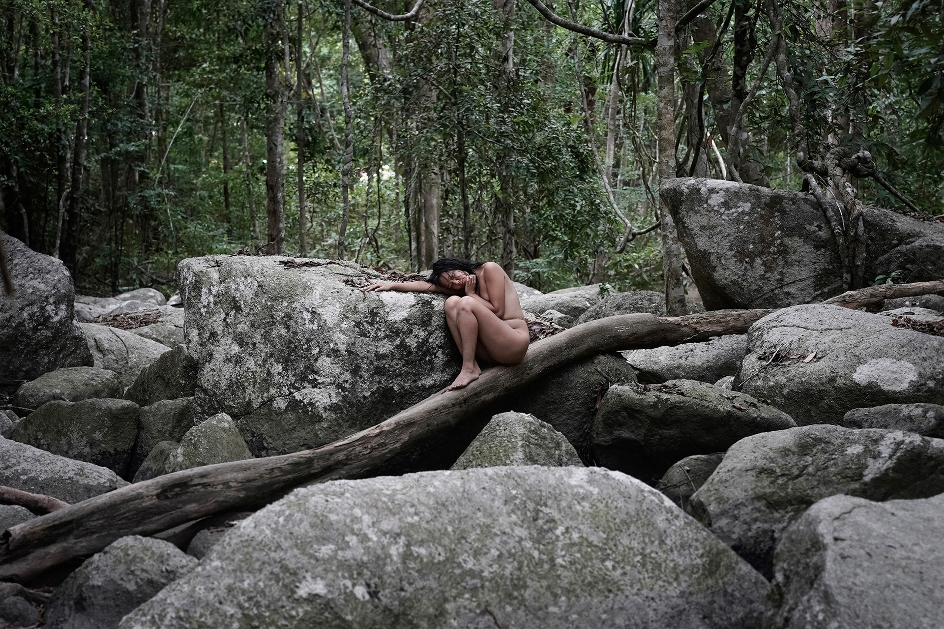 This work is part of a conceptual photography series born from my deep immersion in nature with my movement-improviser friends on a temporarily isolated tropical island during the pandemic. The series explores embodied awareness within a rich natural setting—a non-verbal space where ephemeral, chaotic compositions of the human body emerged through spontaneous contact with the land and with one another.