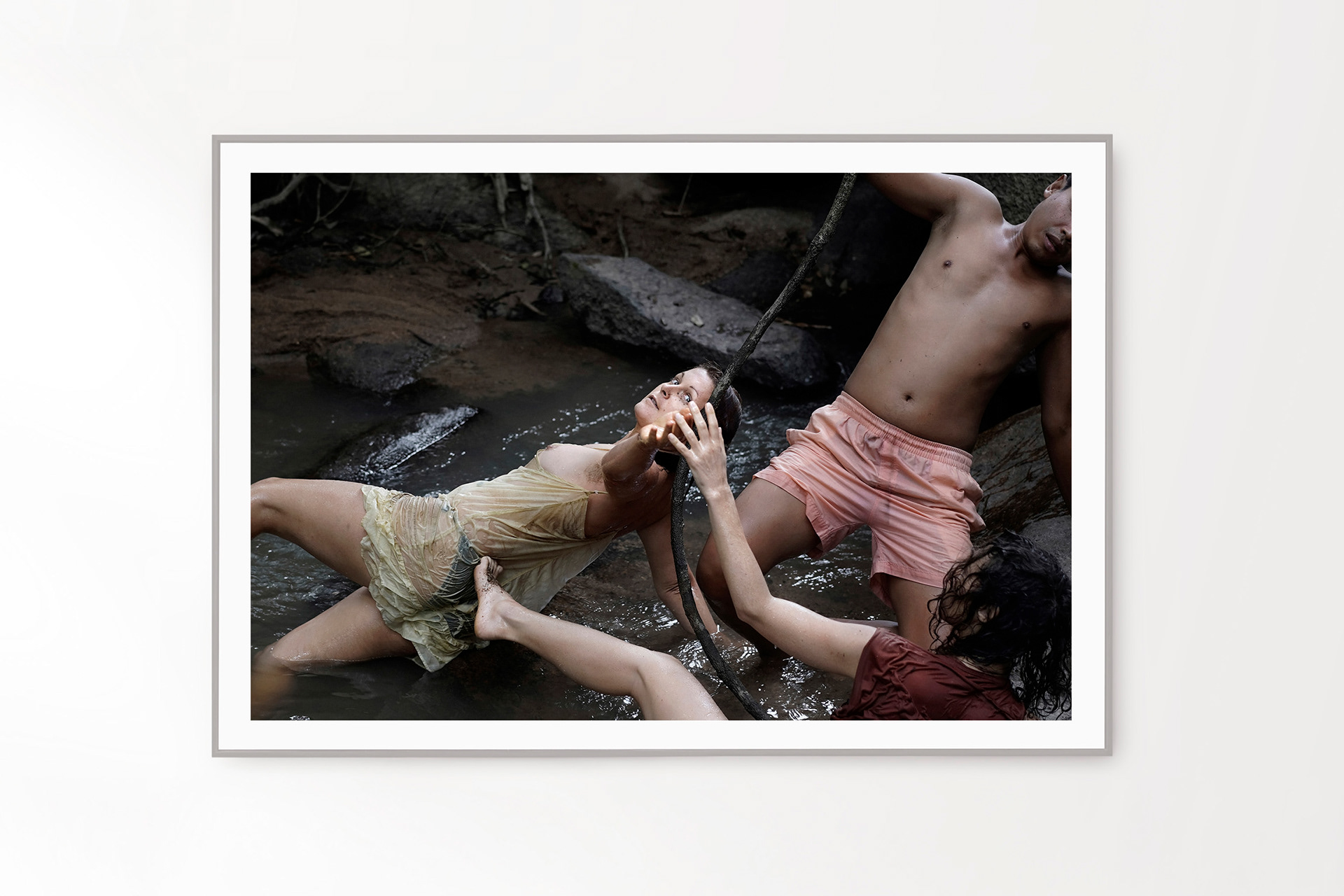This photograph is part of a series created on a secluded tropical island during the pandemic, where I lived and worked with movement-improviser friends in deep connection with the natural landscape. The series captures spontaneous, body-based interactions with nature — moments where human presence blends, dissolves, and reconfigures into new forms.