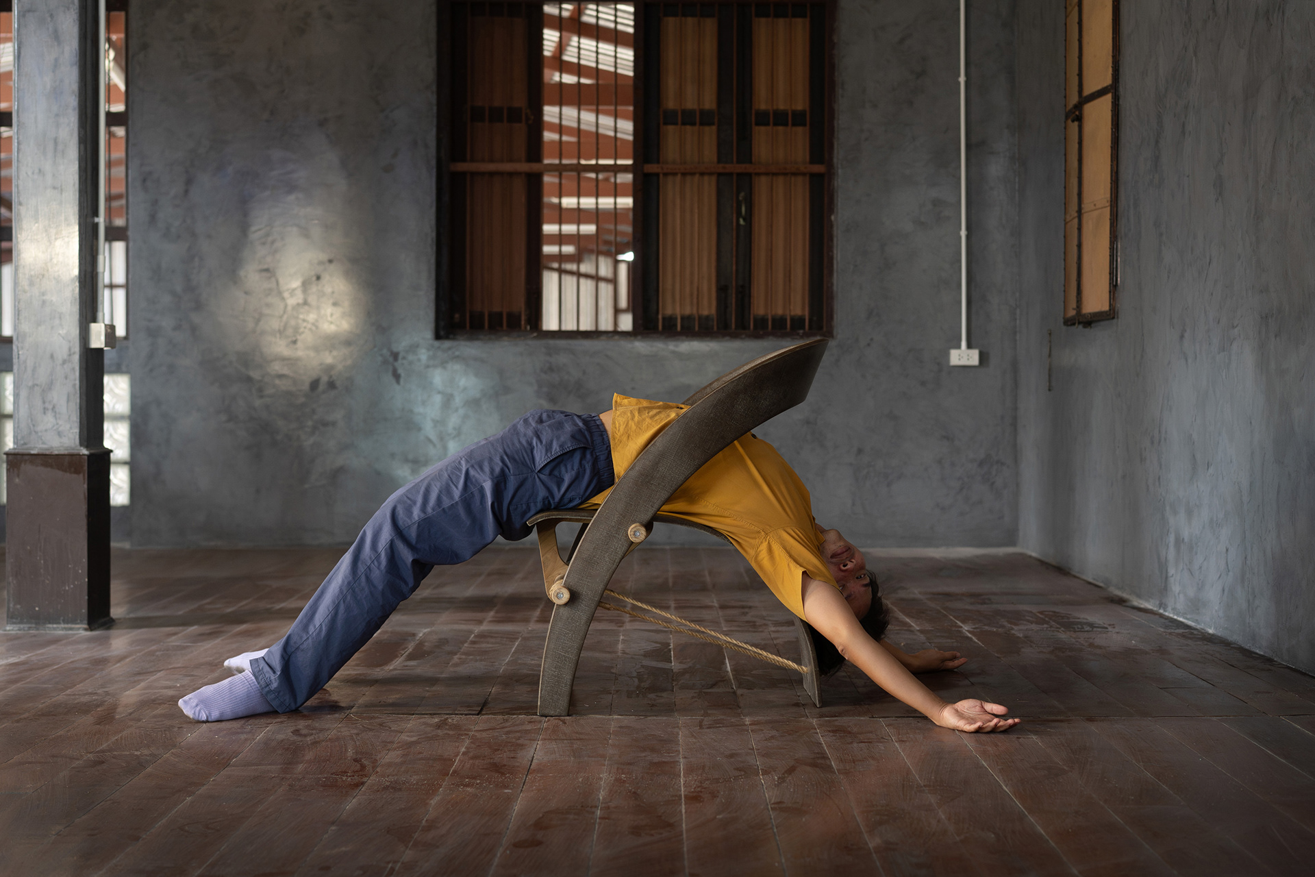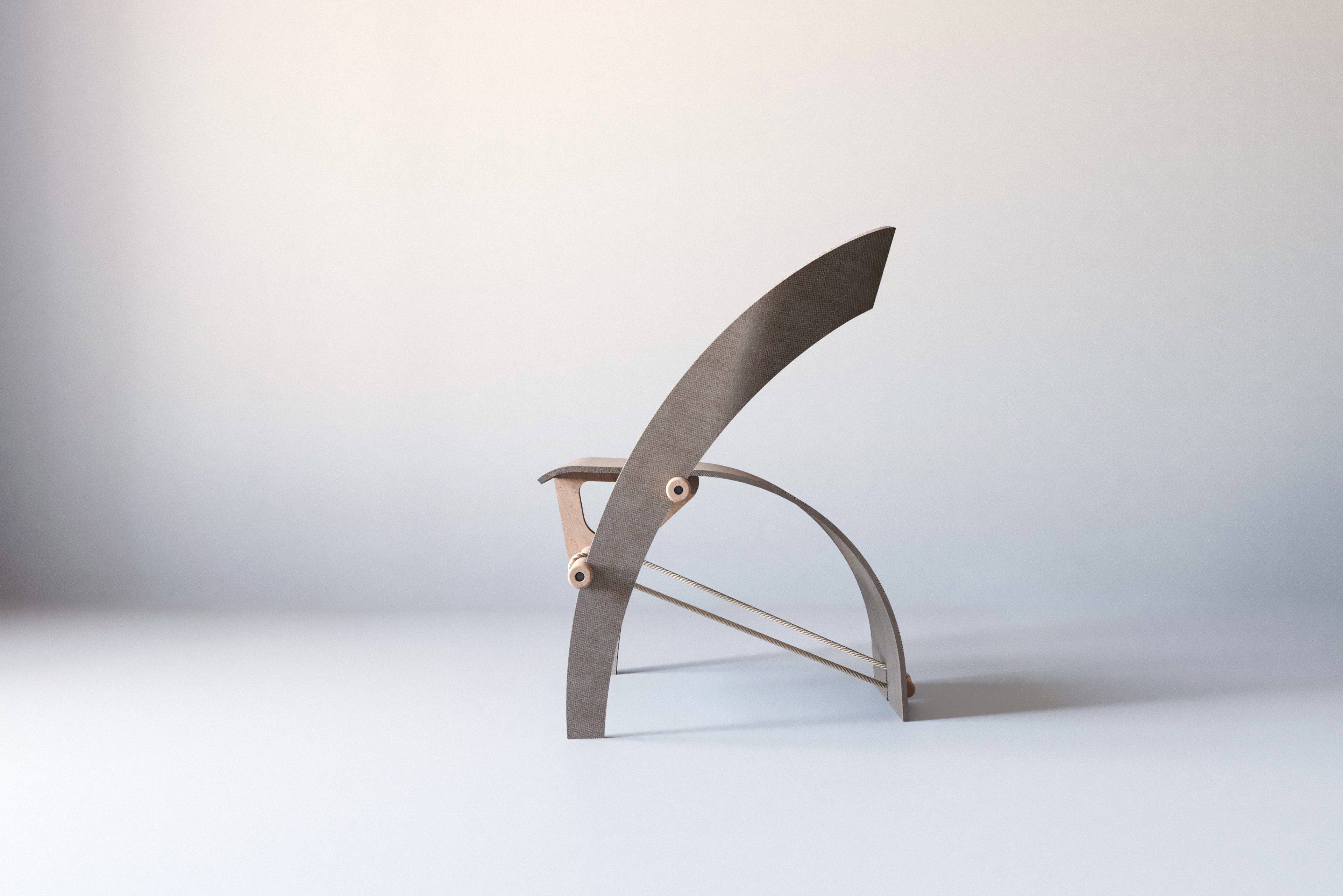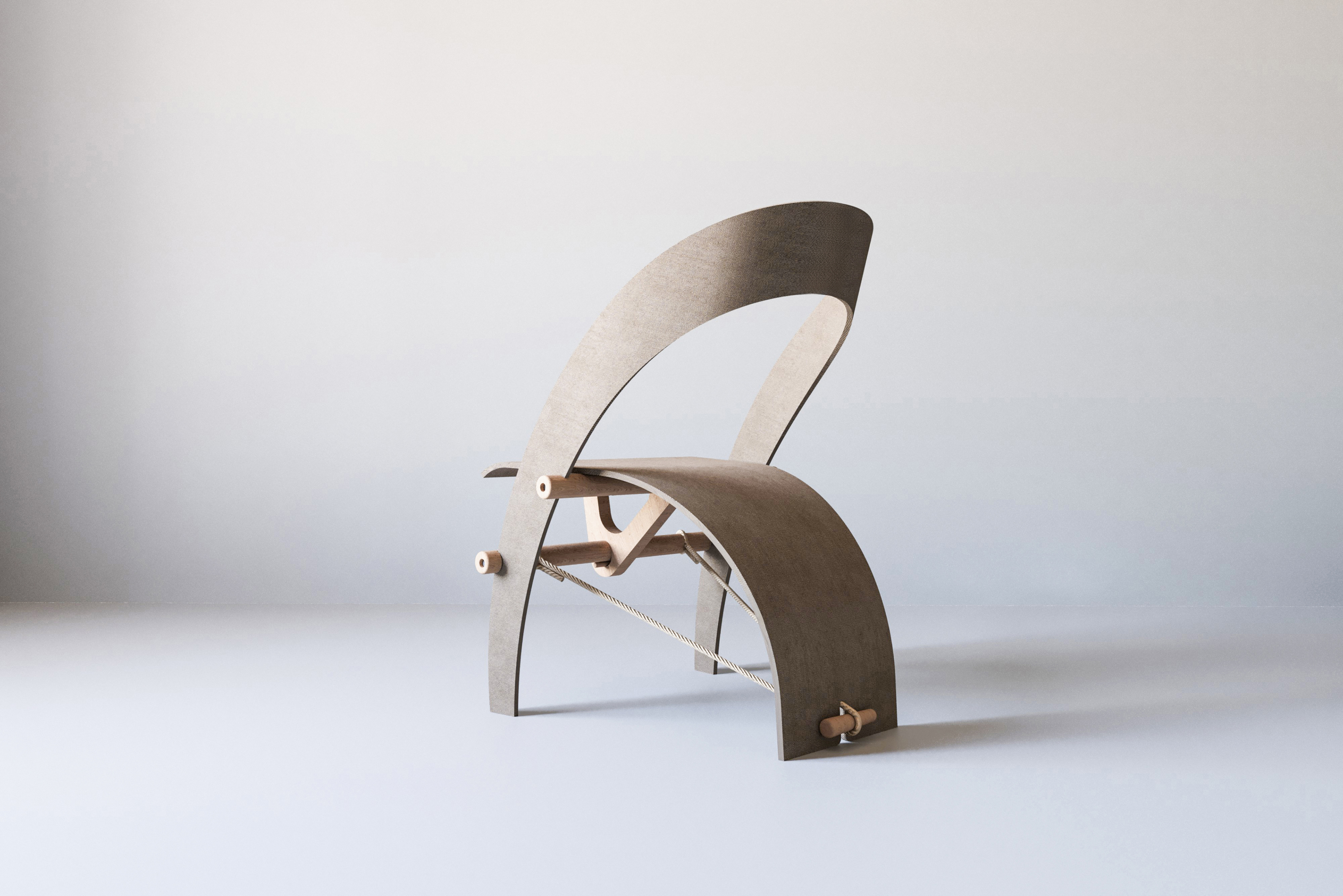 Hemp Chair follows the formal lineage of the Counterpoise Chair, embodying the same structural concept through a different material ethics, with the loom as a quiet reference.