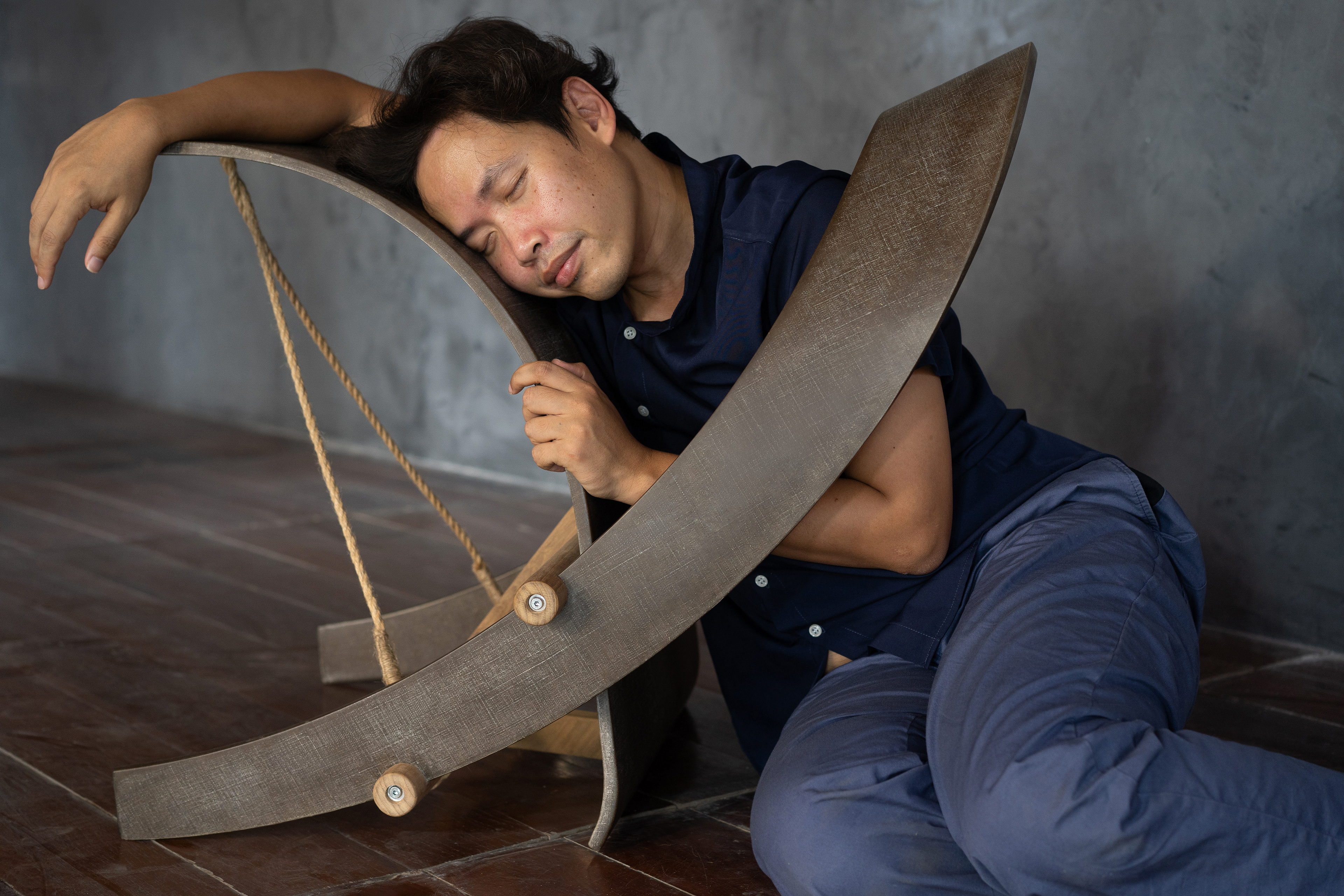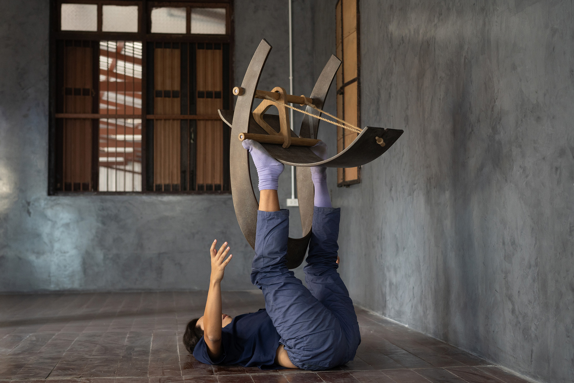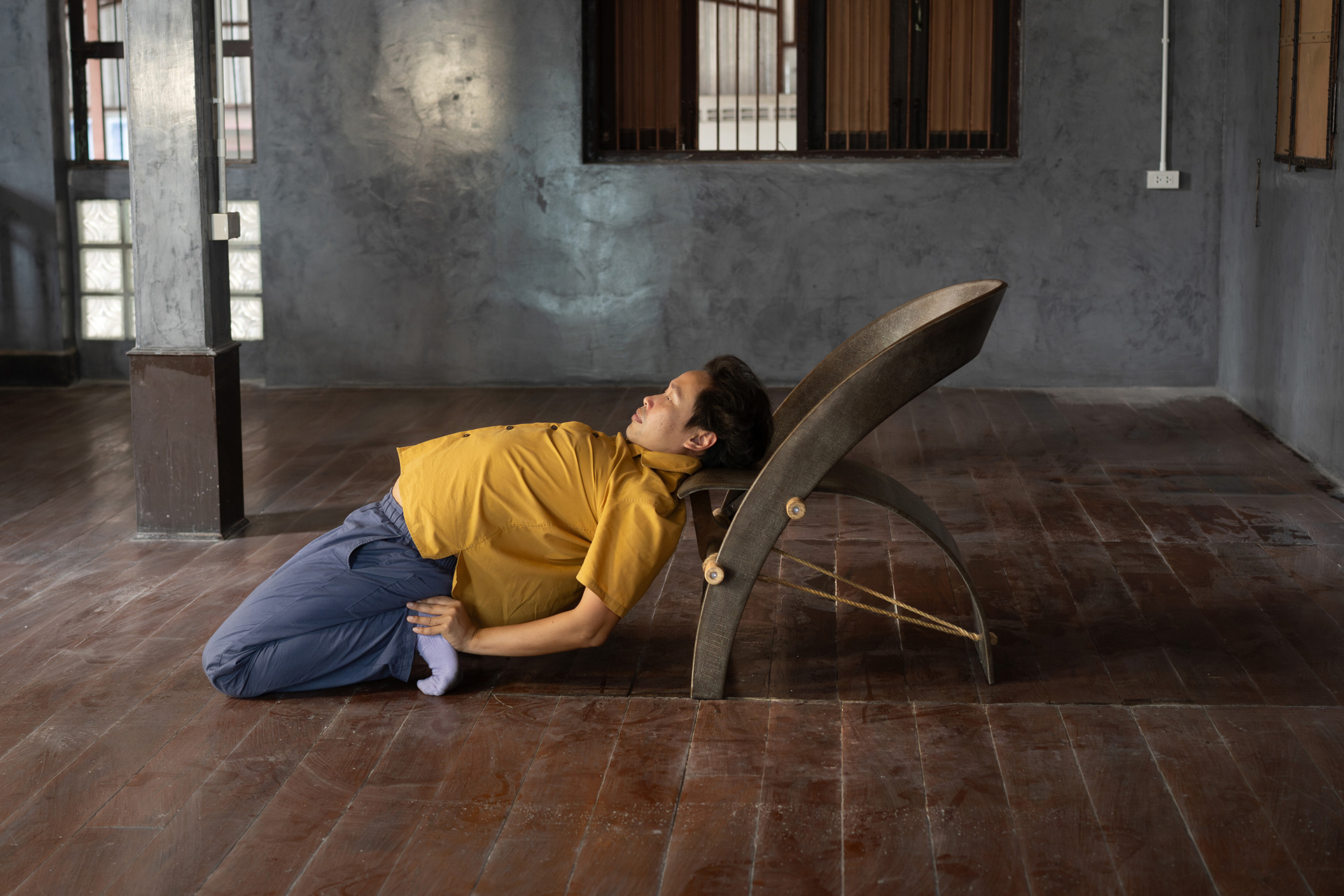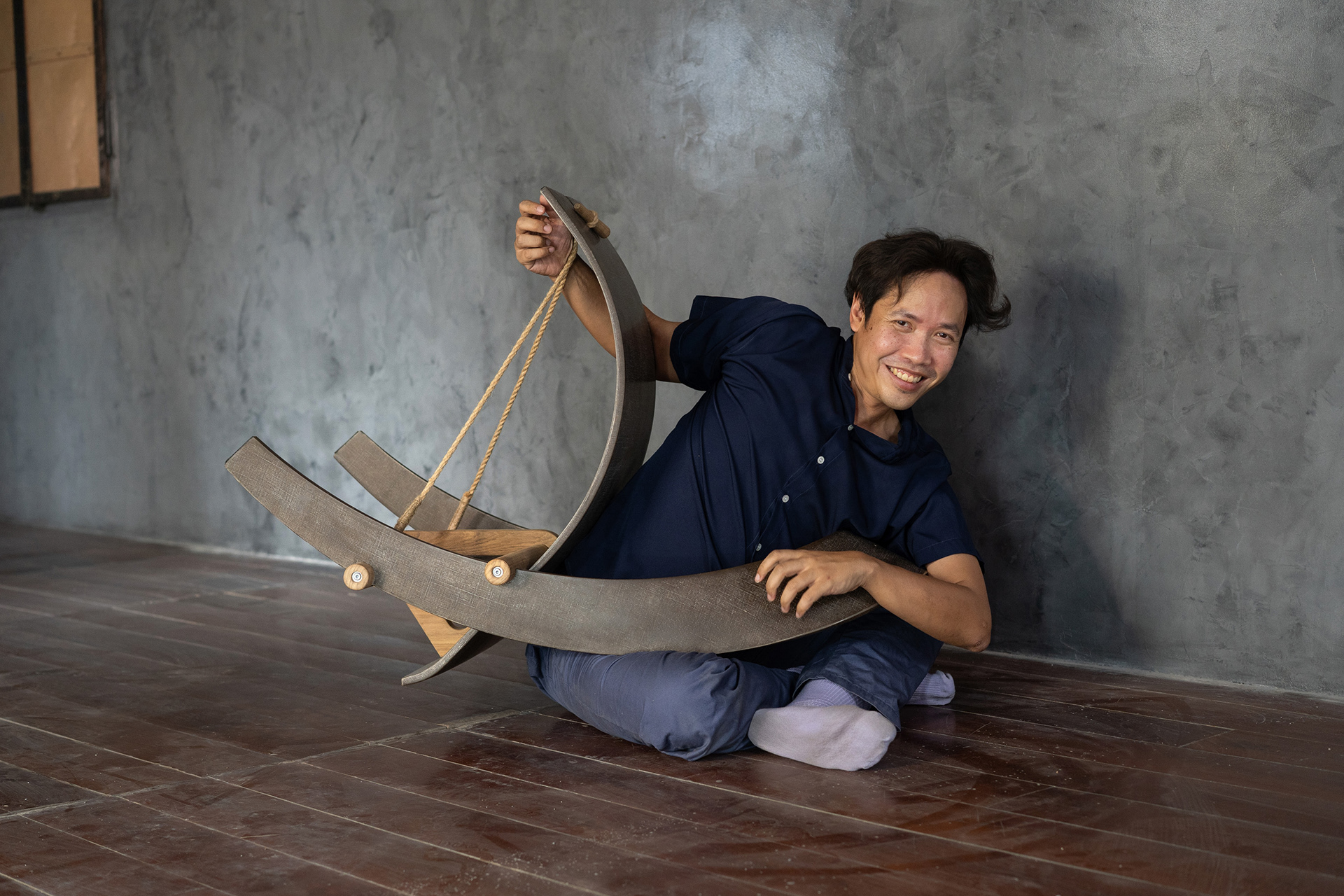 Hemp Chair follows the formal lineage of the Counterpoise Chair, embodying the same structural concept through a different material ethics, with the loom as a quiet reference.